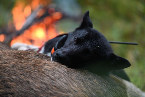 Drygt sju timmars skällning gör att orken tar ut sin rätt, Nelson passar på att vila ut på den varma älgkroppen