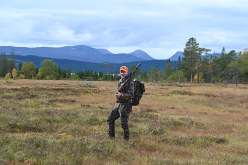 Vi smyger försiktig igen bildörrarna när vi parkerar på norra kanten av jaktmarken i Överäng. Min Östsibiriska laika , ”Gyttjärnsbergets Frisco” Nelson ger sig ivrigt iväg i vidsträckta sökrundor. Morgonen är stilla, och vi njuter av fantastisk natur och slår oss efter en stund ned på ett vindfälle för att vila våra ben, men så plötsligt händer det: 1,7 kilometer bort bryter hundskallen från Nelson tystnaden. Ljudet ekar mellan fjällsluttningarna och får både mig och Fredrik att dra lite extra på mungiporna . Nu är jakten i gång på allvar.